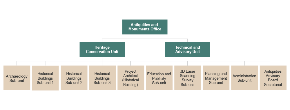 The AMO comprises two major units, namely the Heritage Conservation Unit (HCU), and the Technical and Advisory Unit (TAU), under the organisation below:
