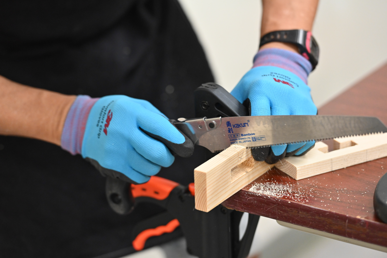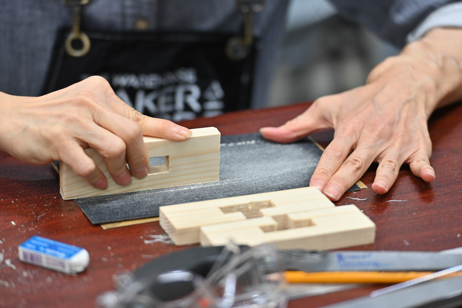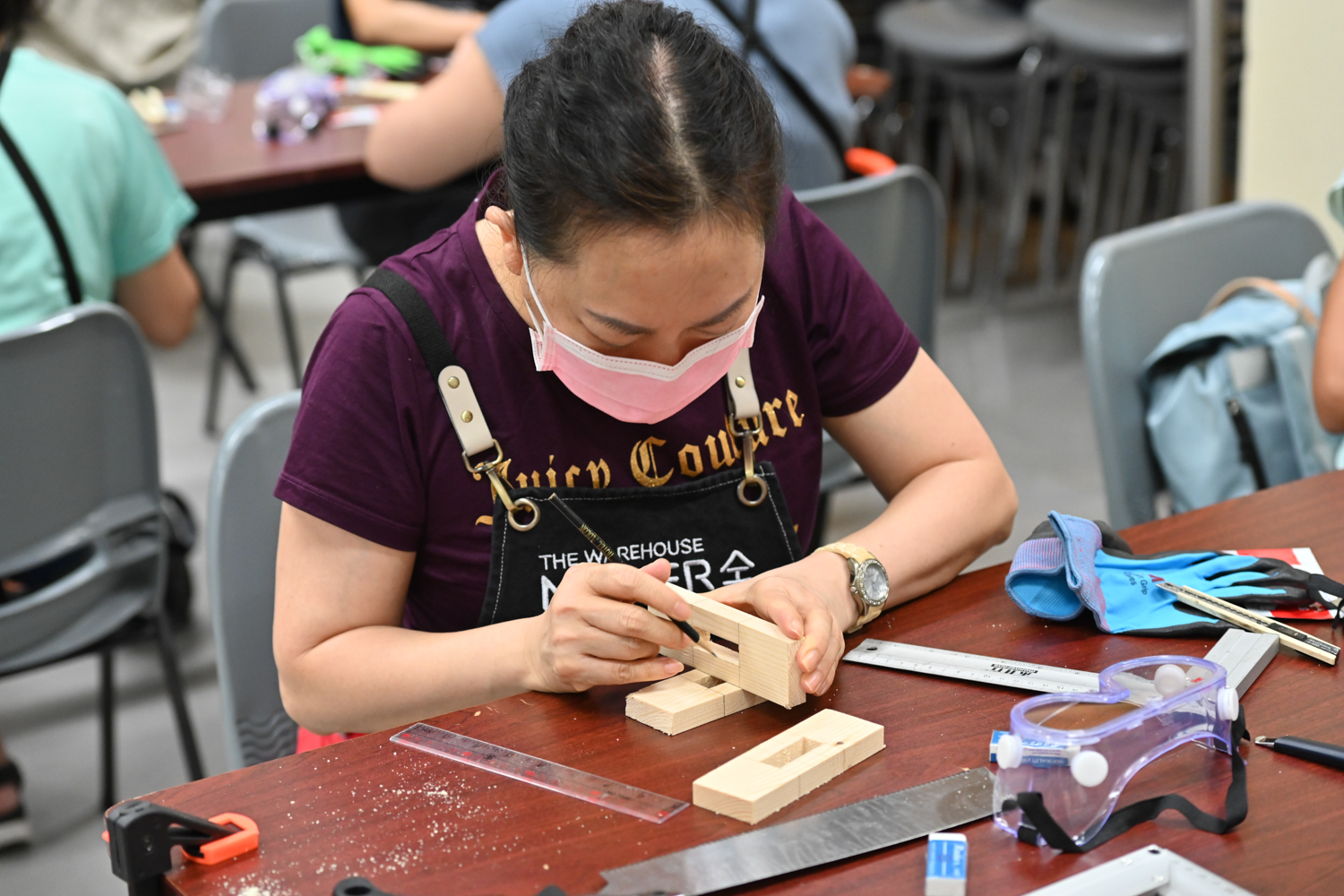 “Lo Pan Lock”(burr puzzle) was said to be invented by Lo Pan, an artisan of Lao in the Spring and Autumn period, which is a wooden mortise and tenon joint structure. This structure is commonly adopted in traditional Chinese wooden buildings. Our tutor taught the participants how to make “Lo Pan Lock” with mortise and tenon joint.