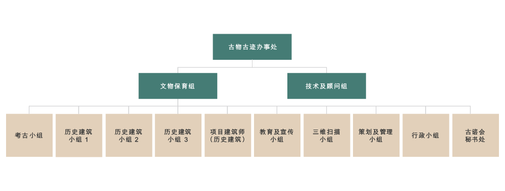 古迹办由文物保育组和技术及顾问组两个主要组别组成。组织架构如下: