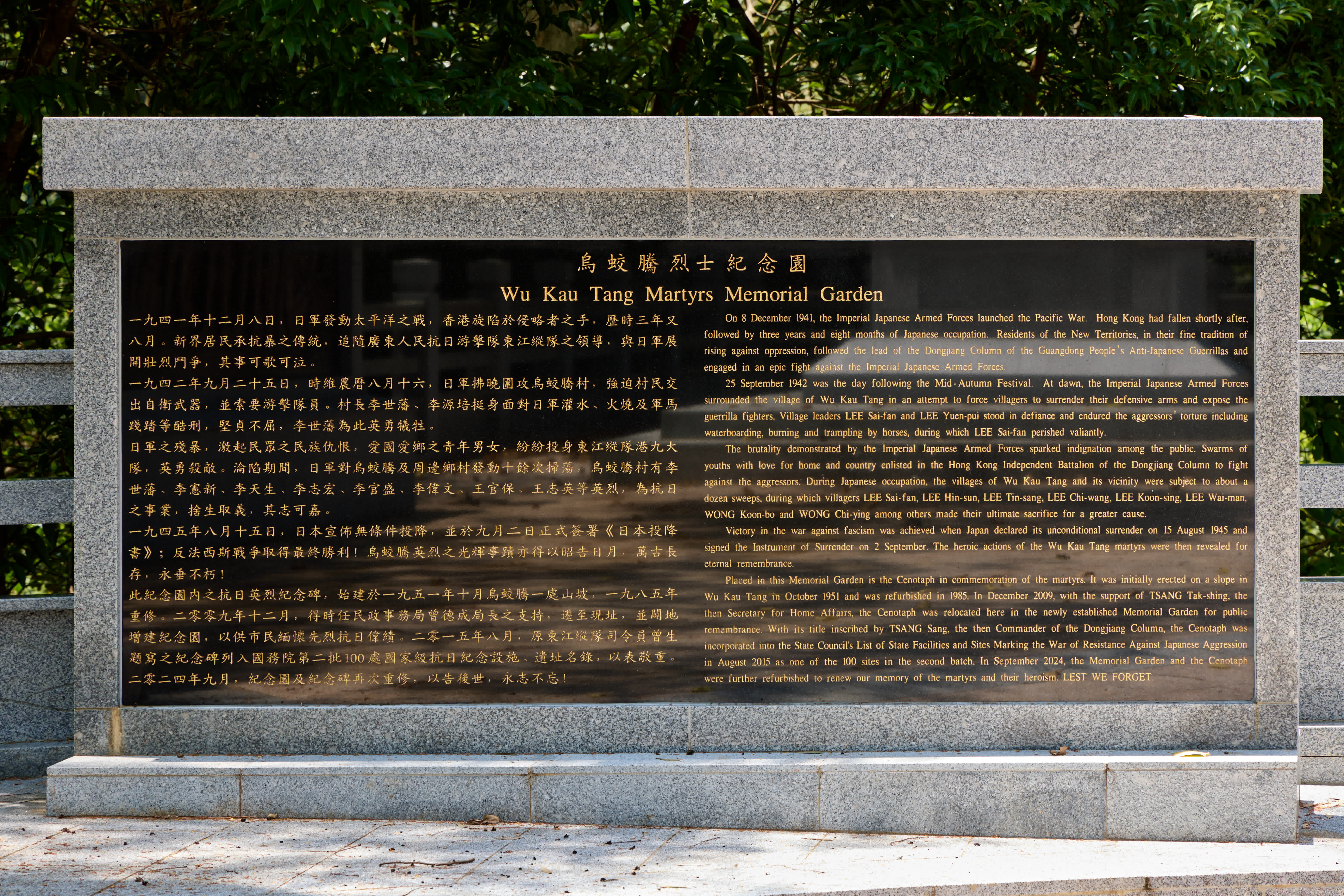 纪念碑于二〇〇九年获政府出资重置至现址及于二〇一〇年九月二十三日开幕。乌蛟腾抗日英烈纪念碑见证乌蛟腾村村民及东江纵队港九独立大队在抗日历史中发挥的重要角色。乌蛟腾抗日英烈纪念碑于二〇一五年八月十三日,获中华人民共和国国务院列入第二批《国家级抗战纪念设施、遗址名录》。
