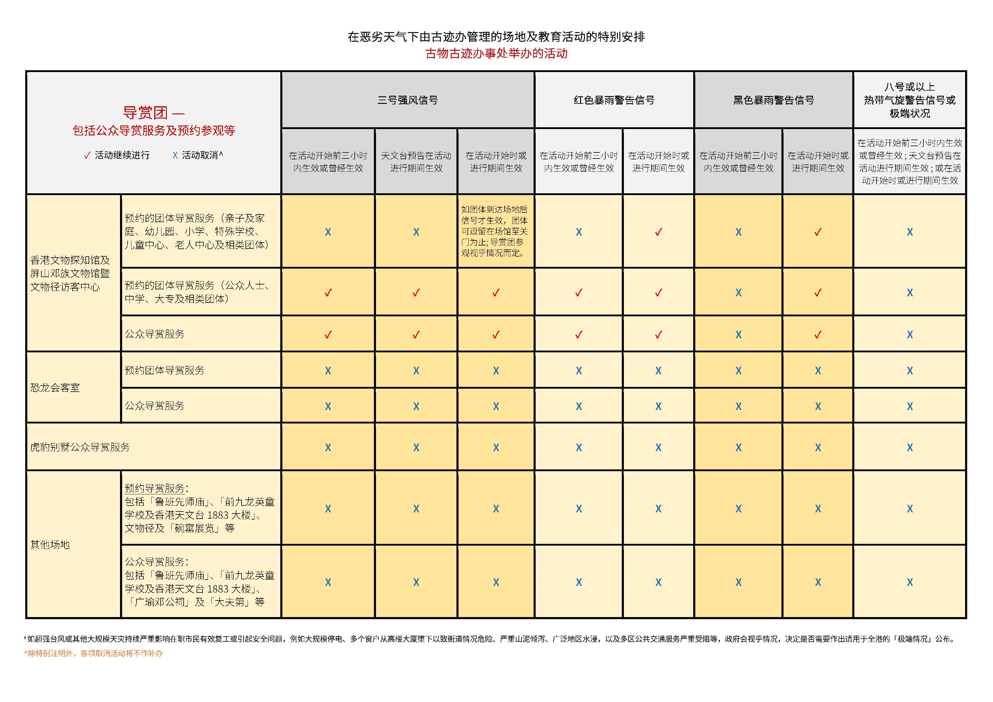 若场地已开放,则开放时间维持不变。若信号在场地开放前已经生效,场地将不会开放,直至信号取消;倘若信号取消时间距离当天休馆时间不足两小时,场地当天将不会开放。 |