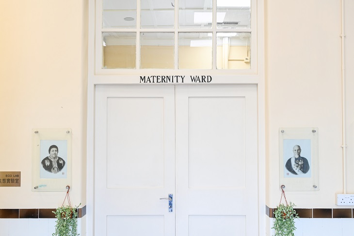 醫局主樓內保留及展示何東爵士及夫人麥秀英的珍貴瓷相 ;門楣上也保留了昔日產房的英文字樣。