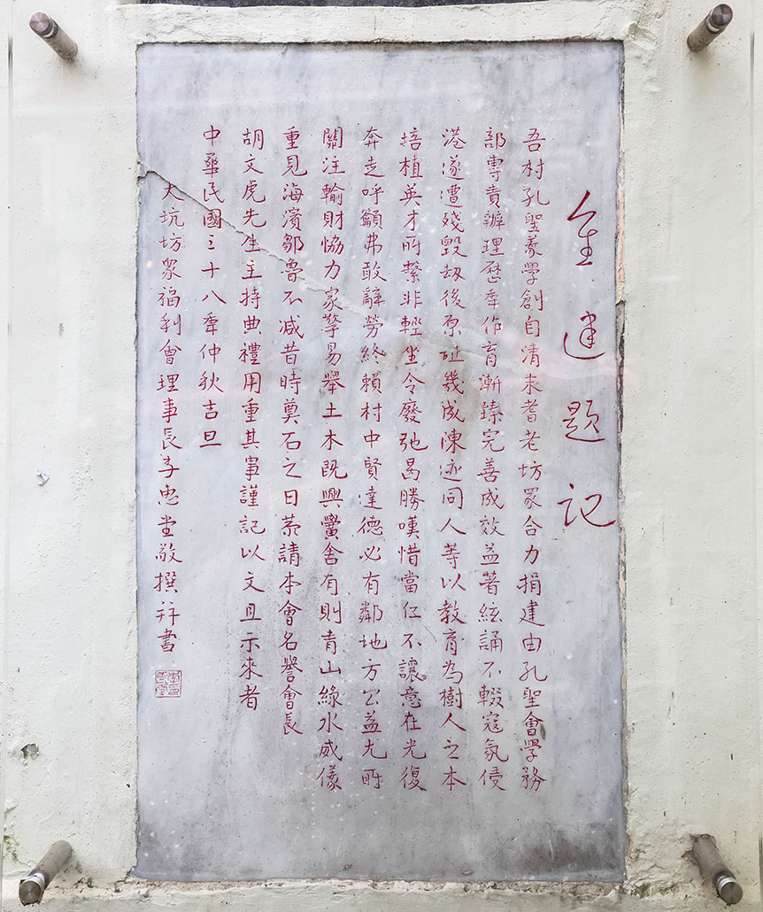 大坑是早期華人聚居地之一,1905年清廷宣布廢除科舉考試後,儒學經典面臨遭摒棄的危機。1907年,《祖國文明報》在廣州提倡開設孔教義學,推廣儒家思想。大坑村民刁振雲響應呼籲,倡議在大坑設立一所義學,他的提議得到商人朱沃鋆的支持,所以他們聯手募捐在書館街12號興建孔聖義學,並由著名華人領袖劉鑄伯創辦的「香港孔聖會」負責辦學,「書館街」的名稱亦由此而來,印證早期香港華人對孔教義學思潮的響應。