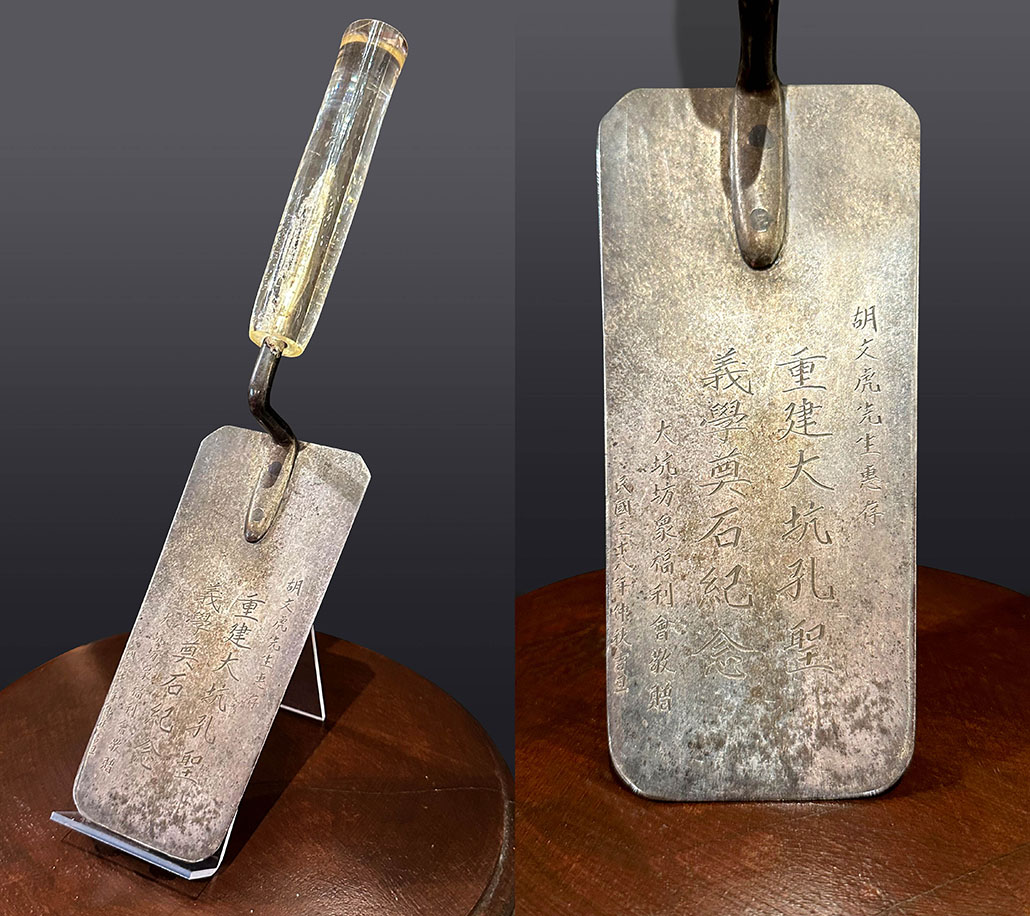 孔聖義學在日佔期間遭到嚴重破壞。戰後,由於大坑村內兒童失學嚴重,大坑坊眾福利會遂發起募捐,籌得港幣三萬二千元重建學校;另外又獲得在大坑修建虎豹別墅的華僑商人胡文虎捐贈港幣一萬元;以及他的兒子胡好捐助學校椅桌。學校重建奠基典禮於1949年8月14日舉行,由胡文虎主持。當時退役著名足球員、大坑坊眾福利會理事長李惠堂亦有出席典禮。同年11月20日孔聖義學進行啟鑰典禮,由胡好、李惠堂及大坑坊眾福利會理事長冼培坤主禮。建築昔日正門旁,現時仍保存1949年李惠堂為紀念學校重新落成啟用而撰寫的〈重建題記〉石碑。
