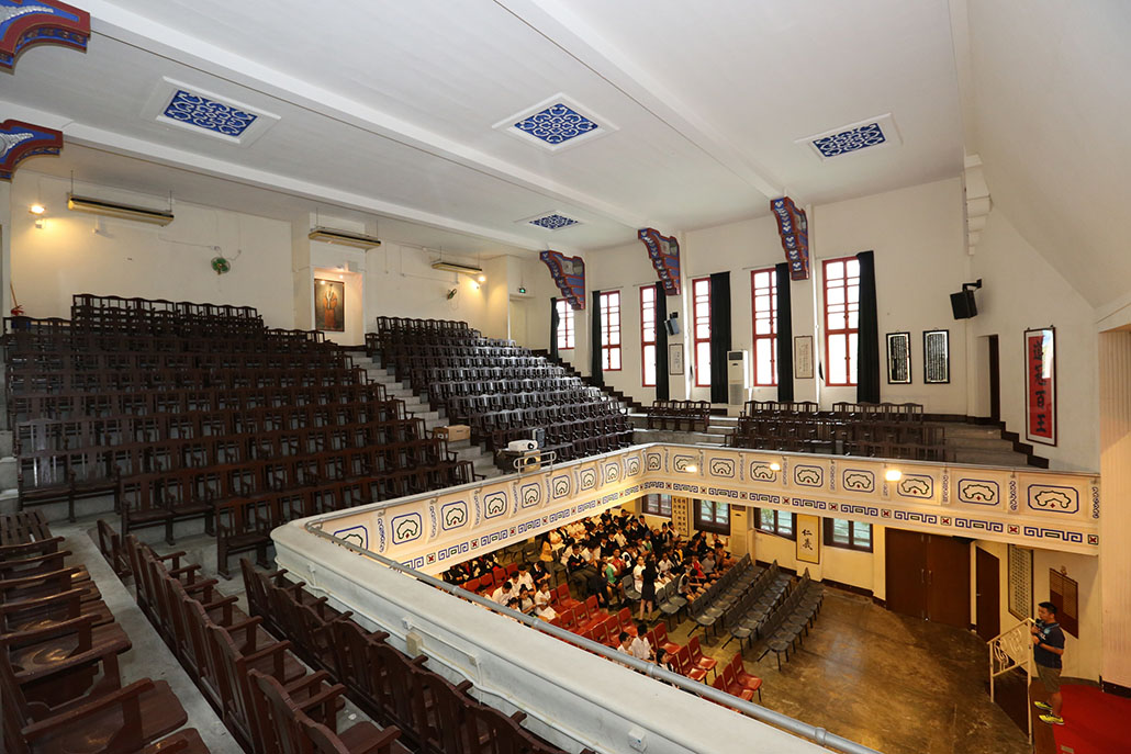 孔聖講堂由廣東新會人譚肇康設計,他畢業於香港聖保羅書院,後在遼寧大連學習建築設計。孔聖講堂糅合了中國傳統建築的雀替、斗栱、如意圖案及西方現代主義的簡樸、混凝土建築元素,内部採用懸吊屋頂,講堂無一直柱。簡孔昭於孔聖堂開幕典禮致辭中說出,期望宏偉的建築設計,能使大眾「見之而景仰」和「引起尊聖道之心」。講堂內保存大量珍貴牌匾和對聯,例如廣州志德嬰孩醫院贈予講堂的對聯、由移居香港的清末榜眼清遠人朱汝珍,代表孔教學院祝賀講堂落成所題的「闡揚聖教」牌匾,牌匾仍懸掛於正門上。講堂內外皆體現了大灣區長久以來緊密的人情脈絡。