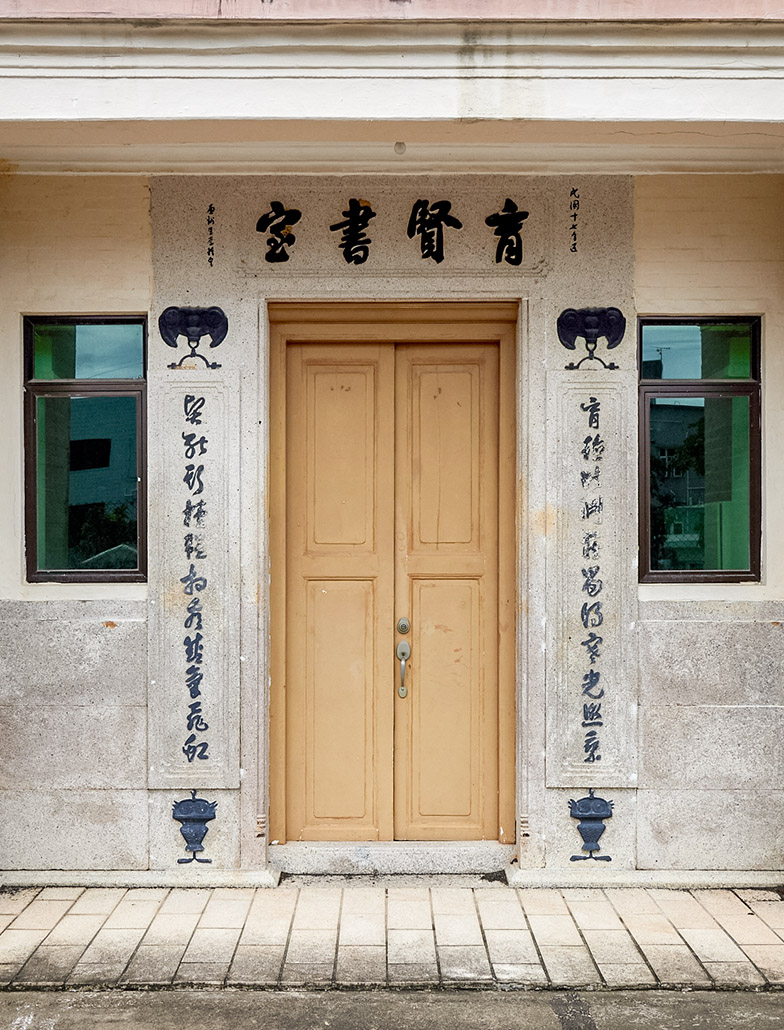 育賢書室位於西貢沙角尾村,建於1928年,由韋氏成員捐地及移居海外的村民捐資興辦,在二次大戰前提供俗稱「卜卜齋」的書塾教育。書室設有前後院,牆身以青磚築砌,正面門楣仍見「民國十七年建」和外牆上端的三角楣飾「1928」字樣,顯示建造年份。一樓陽台則飾以西式圓柱和拱門,配以花瓶狀欄杆,兼具中西建築特色。