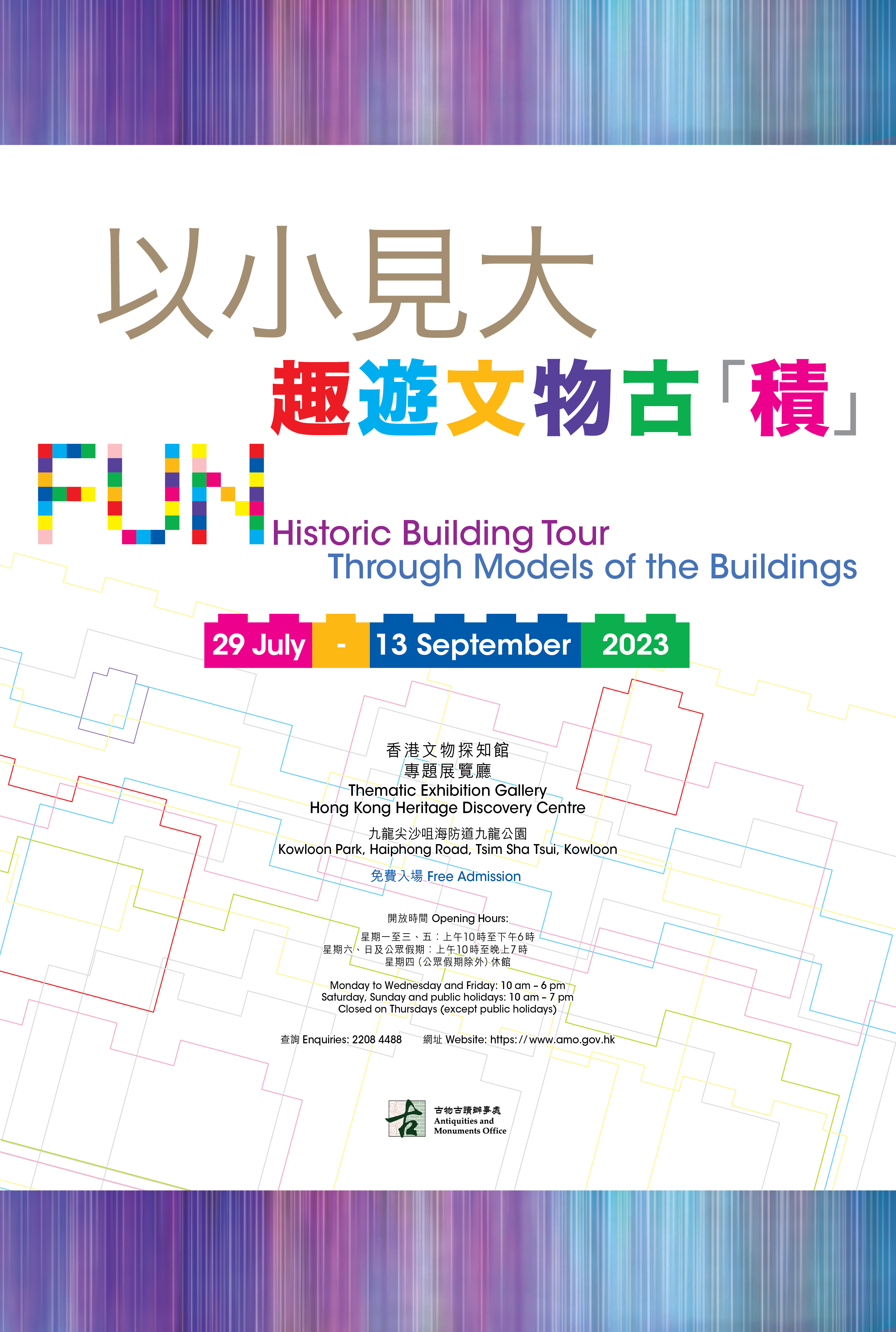 香港文物建築多樣,各具特色。現時,香港有超過110項歷史建築已根據《古物及古蹟條例》(香港法例第五十三章)被列為法定古蹟受到法例保護;超過1,200項獲評級並受行政措施保護。是次展覽融匯童趣與古蹟,展示由玩具積木嵌砌而成的法定古蹟及歷史建築模型,涵蓋香港不同時期、形式、族群、宗教的特色建築,包括2022年被列為法定古蹟的回教清真禮拜總堂、雷生春及香港大會堂;以及宣揚儒學、於2020年評為一級歷史建築的孔聖講堂等,展現香港文化多元、和而不同的面貌。層層堆疊的積木構件作為巨型建築的縮影,鉅細無遺地展示建築結構及構件之美,讓你以小見大,趣見歷史建築的非凡構造及建築工藝的匠心獨運。