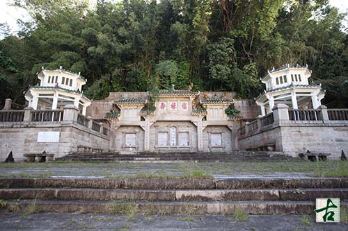 紀念碑的最高一層地台建有兩個涼亭,中間一層的中央為紀念牌樓,最低一層有一對化寶塔。地台全部鋪砌花崗石條,由一段段的花崗石級連起,並設有欄杆柱扶手。前方用以支撐最低一層地台的花崗石護土牆則砌成弧形,與傳統中式墳地的造型呼應。紀念碑的整體設計糅合西方古典建築與傳統中式建築的元素,極具心思。