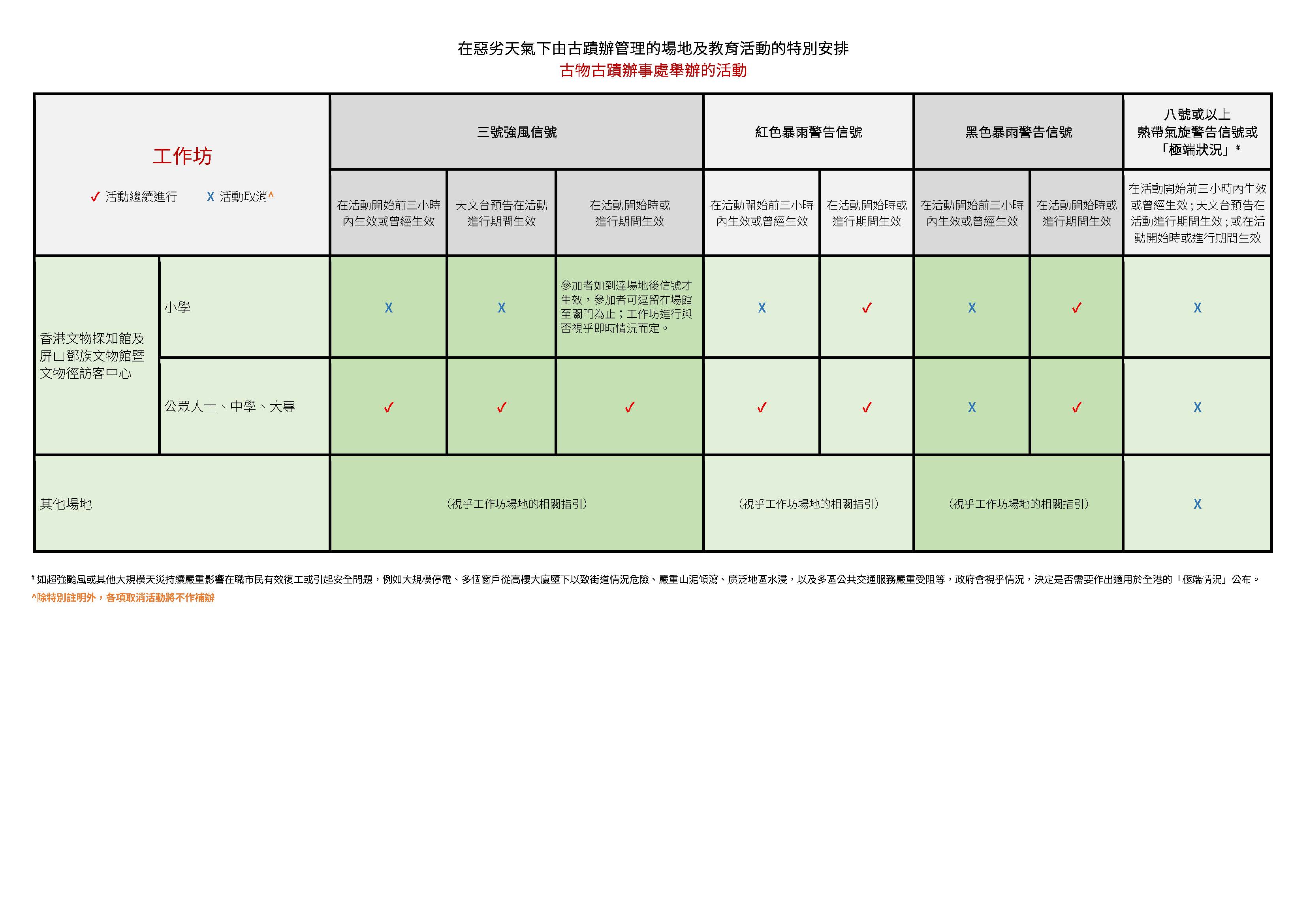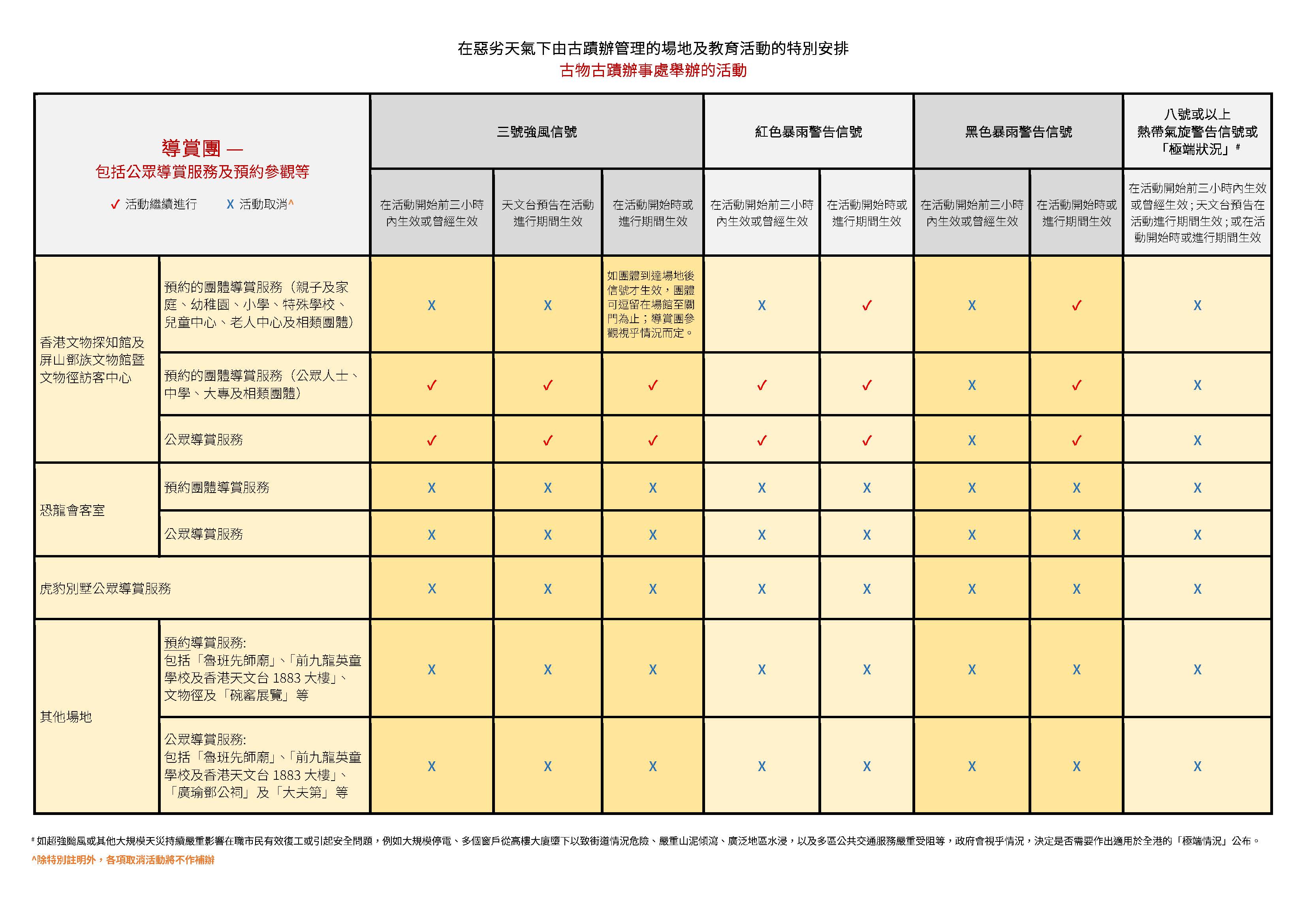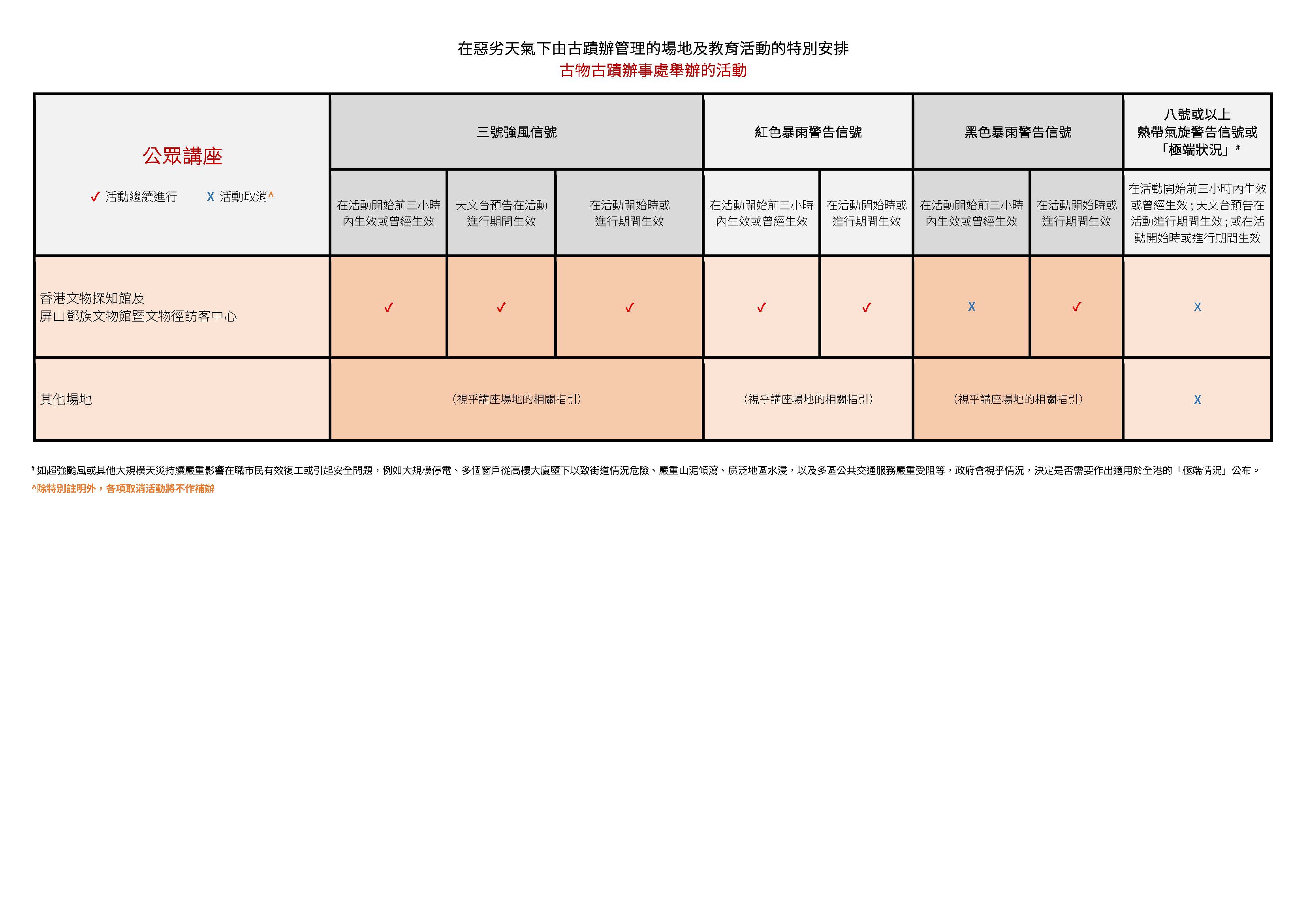 若場地已開放,則開放時間維持不變。若信號在場地開放前已經生效,場地將不會開放,直至信號取消;倘若信號取消時間距離當天休館時間不足兩小時,場地當天將不會開放。 |